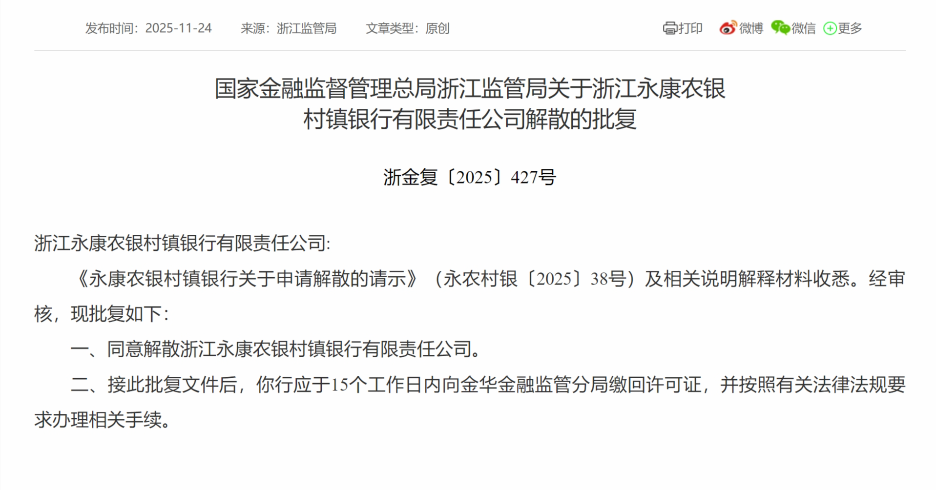 11月24日,国家金融监督管理总局浙江监管局发布《关于浙江永康农银村镇银行有限责任公司解散的批复》,同意解散浙江永康农银村镇银行有限责任公司。